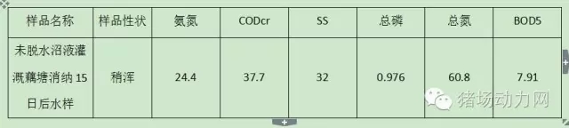 脫水沼液灌溉藕塘消納7日后水樣指數(shù)變化表二: